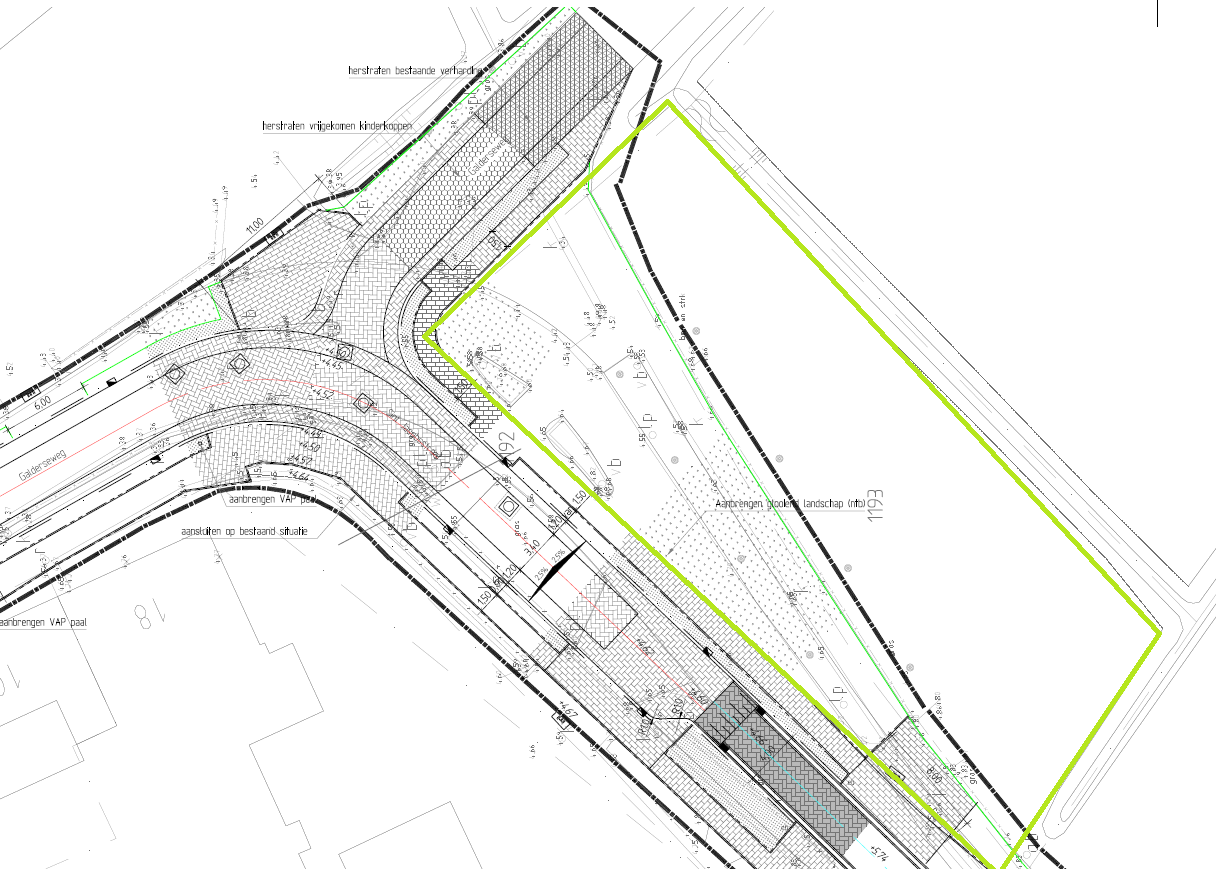Het groene vak in onderstaande tekening geeft het plangebied aan. Dit bestaat uit de vrijgekomen ruimte en de bestaande parkeerplaats.